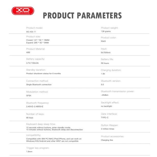اولین چیزی که توجه هر کاربری را جلب میکند، طراحی مینیمال و هوشمندانه کیبورد XO KB-11 است. این کیبورد در حالت بسته تنها 147 × 92 × 18 میلیمتر اندازه دارد و مثل یک دفترچه کوچک در دست جا میشود. وقتی آن را باز کنید، فضایی به اندازه 295 × 92 میلیمتر خواهید داشت که با 66 کلید واکنشپذیر و استاندارد پر شده است.