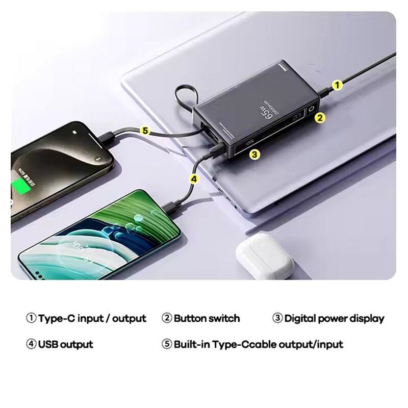 - پورت Type-C دوطرفه: برای شارژ پاوربانک و همچنین خروجی تا ۶۵ وات
