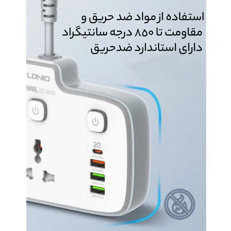با زیاد شدن دستگاه های الکترونیکی و احتیاج به تامین انرژی آن ها نیاز به چند راهی ها هم جهت سهولت کار بیشتر شده است. چندراهی های جدید درگاه های متفاوتی هم در اختیار شما قرار میدهد تا کار شما رو راحتتر کند. چندراهی LDNIO SC2413 گزینه مناسبی برای شماست چون علاوه بر دو خروجی برق، سه خروجی USB و یک خروجی تایپ سی دارد. جنس چندراهی الدینیو از ABS و PC نسوز ساخته شده است. قسمتی که به برق متصل میشود از نوع EU است که یعنی دوشاخه است و در ایران رایج است و نیاز به خرید تبدیل جداگانه ندارید. خروجیهای برق روی چندراهی هم از نوع Universal هستند و با دو شاخههای UK، US و EU سازگارند و شما از تبدیل بی نیاز می کنند. سیم اتصال طول کمی دارد و در حدی است که بتوانید تا 180 درجه زاویه دلخواه خود را تنظیم کنید. برای کنترل جریان برق الدینیو 3 کلید برای هر خروجی برق و حتی مجموعه پورتها روی بدنه به تفکیک در نظر گرفته که میتوانید جریان برق هر کدام را قطع و یا وصل کنید که در هنگام به خطر افتادن ایمنی نیز به صورت خودکار عمل می کند. ولتاژ ورودی چندراهی SC2413 برابر 100 تا 250 ولت و حداکثر جریان ورودی 10 آمپر می باشد. پورت تایپ سی روی چندراهی با پشتیبانی از قابلیت شارژ سریع PD دارای جریان/ولتاژ خروجی 5V/3A-9V/2.22A-12V/1.67A با حداکثر توان خروجی 20 وات می باشد. یکی از خروجیهای USB به رنگ نارنجی با پشتیبانی از شارژ سریع QC3.0 دارای جریان/ولتاژ خروجی 5V/3A-9V/2A-12V/1.5A با حداکثر توان خروجی 18 وات می باشد. پورت های خروجی USB به رنگ سبز هر کدام با پشتیبانی از شارژ Auto ID دارای جریان/ولتاژ خروجی 5V/2.4A و حداکثر توان 12 وات می باشند. توان خروجی کل چندراهی برق الدینیو برای پورتهای USB و Type C برابر 20 وات است و برای خروجی های برق هم 2500 وات است. می توانید همزمان از خروجیهای این چند راهی استفاده کنید و 6 دستگاه را شارژ نمایید. فقط مانند بسیاری از شارژرها و چندراهی ها در این صورت توان خروجی بین آن ها تقسیم می شود. چندراهی الدینیو برای حفاظت از کودکان دارای درپوش روی حفره سوکت های برق است. همچنین در صورت تشخیص اضافه بار در مدار و یا رطوبت جریان را قطع می کند. عمق حفره های سوکت برق به اندازه کافی است تا دوشاخه بیرون نماند. میتوانید با خیال راحت از خرید یک چندراهی با کیفیت و ایمن لذت ببرید.