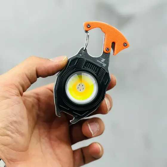 در کنار قسمت کارابین شکل یا همان گیرهی آویز چراغ، یک تیغهی کوچک طراحی شده است. این تیغه داخل بدنه جای داده شده است و خطری ندارد؛ اما میتوان با وارد کردن طناب و بند به محفظهی تیغه، آنها را برش داد.