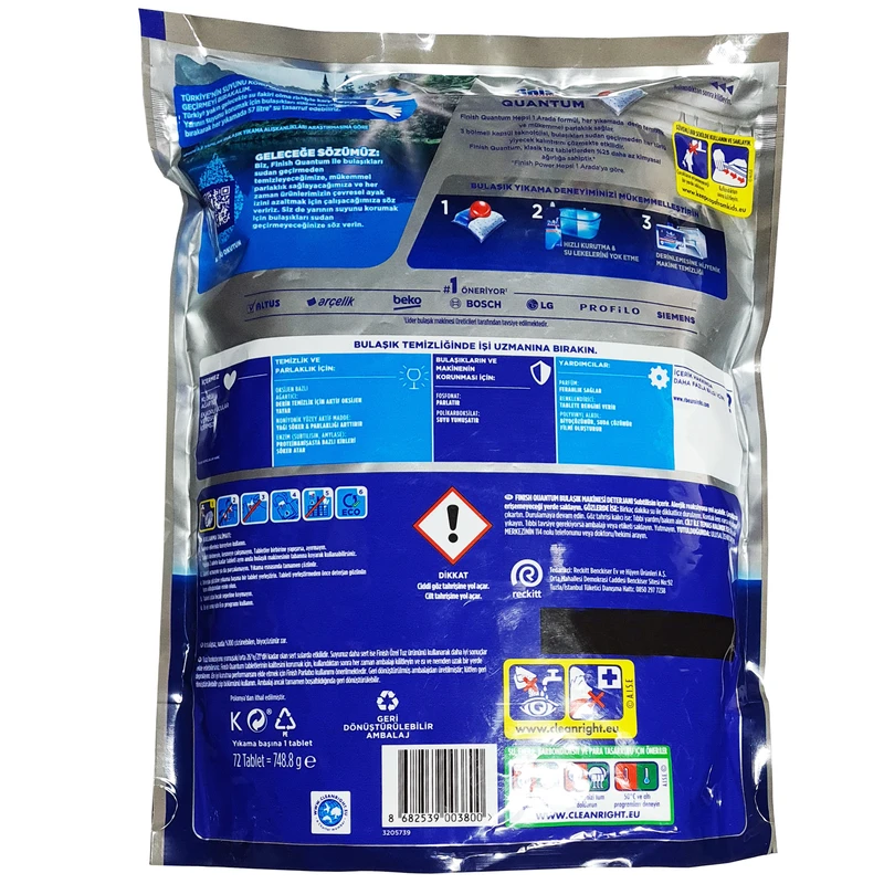 برند فینیش یکی از معتبرترین برندهای تولید کننده شویندههای خانگی است که محصولات خود را در کشورهای مختلف تولید میکند. اما قرص ماشین ظرفشویی فینیش Quantum مدل Hepsi 1 Arada در کشور ترکیه تولید میشود. این موضوع نشان میدهد که کیفیت و استانداردهای بالای تولید در این کشور، معمولاً محصولات فینیش را به انتخاب اول بسیاری از مصرفکنندگان تبدیل میکند.